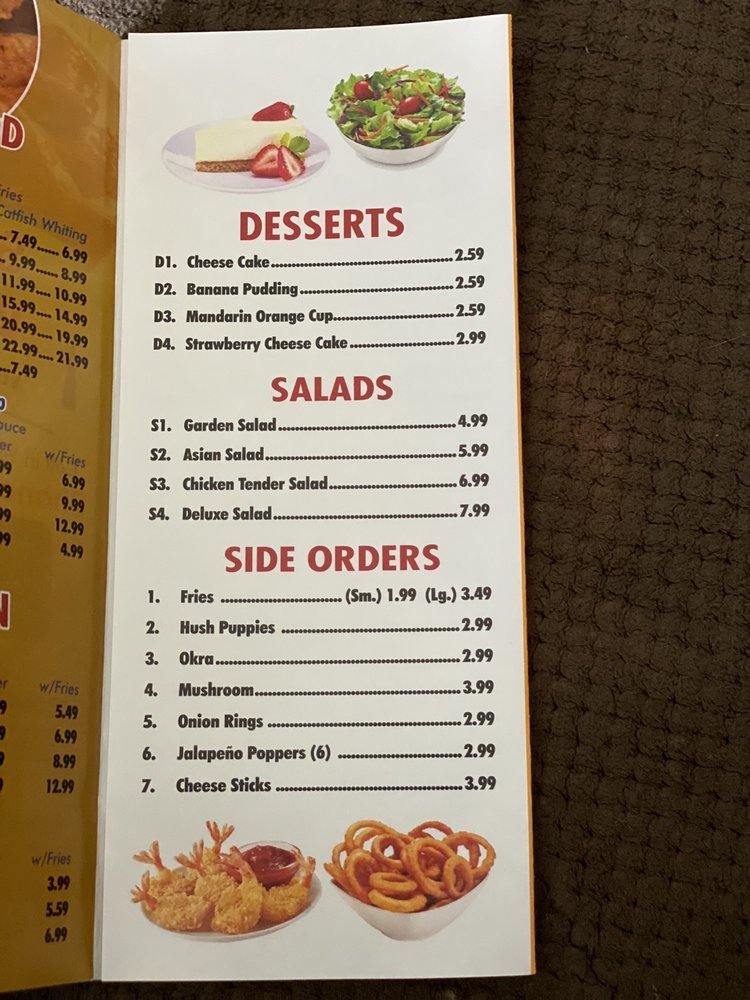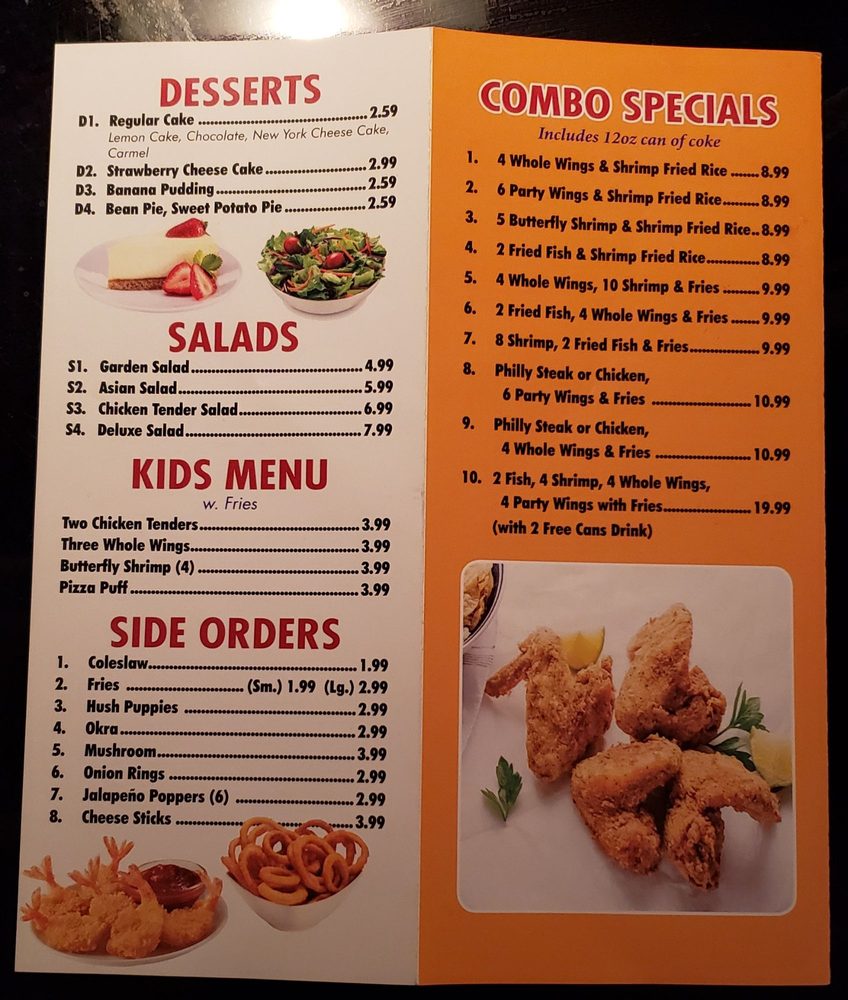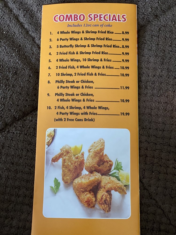 2 fish,4 butterfly shrimp,4 whole wing, 4 party wing and fries.